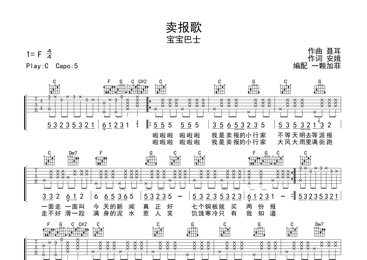 《卖报歌》是宝宝巴士演唱的一首歌曲,拍号为4/4拍,本吉他谱采用的是C调指法编配,变调夹5品弹奏即为原调,当然也可以根据自己的音域改变变调夹位置,或者通过改变和弦调性,以方便自己弹奏,这份吉他谱共有一张高清图谱,图谱由 @一颗加菲 编配上传,图谱使用六线谱编配,包含吉他和弦指法、简谱以及歌词部分,曲谱配备了相关的音频提供试听,使用这份卖报歌吉他谱,可以让你更加方便地掌握这首歌曲的弹唱技巧,快来尝试吧。