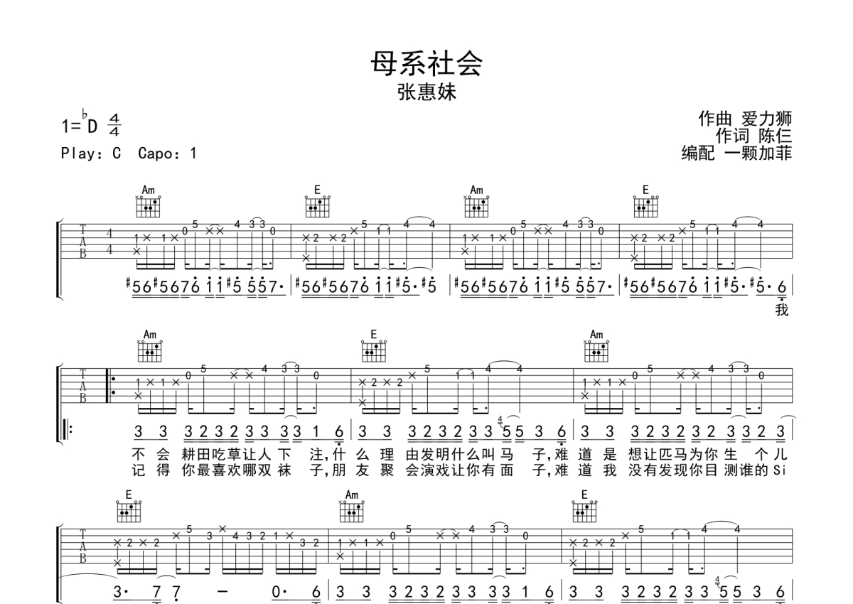 张惠妹《母系社会》吉他谱 - C调弹唱六线谱