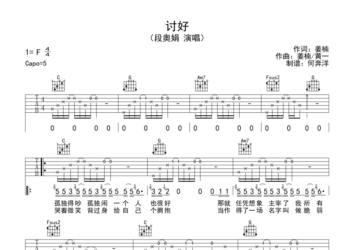《讨好》是段奥娟演唱的一首歌曲,本吉他谱采用的是C调指法编配,这份吉他谱共有两张高清图谱,图谱由 @何奔洋 编配上传,图谱使用六线谱编配,包含吉他和弦指法、简谱以及歌词部分,曲谱配备了相关的音频提供试听,使用这份讨好吉他谱,可以让你更加方便地掌握这首歌曲的弹唱技巧,快来尝试吧。段奥娟《讨好》吉他谱_C调吉他弹唱谱。