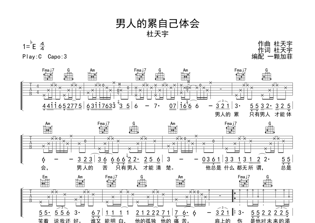 《男人的累自己体会》是杜天宇演唱的一首歌曲,拍号为4/4拍,歌曲原调为Eb调,但由于原调指法比较难,为了方便弹奏,本吉他谱采用的是C调指法编配,变调夹3品弹奏即为原调,当然也可以根据自己的音域改变变调夹位置,或者通过改变和弦调性,以方便自己弹奏,这份吉他谱共有两张高清图谱,图谱由 @一颗加菲 编配上传,图谱使用六线谱编配,包含吉他和弦指法、简谱以及歌词部分,使用这份男人的累自己体会吉他谱,可以让你更加方便地掌握这首歌曲的弹唱技巧,快来尝试吧。