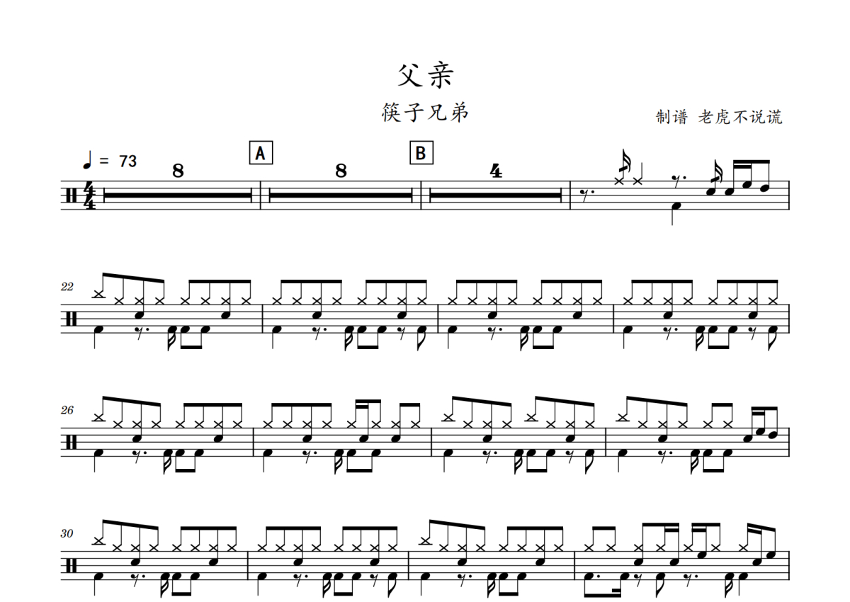 《父亲》是筷子兄弟演唱的一首歌曲,拍号为4/4拍,歌曲速度为每分钟73拍,这份鼓谱共有两张高清图谱,图谱由 @老虎不说谎 编配上传,图谱使用五线谱编配,使用这份父亲架子鼓谱,你将能够轻松地敲打出这首筷子兄弟的父亲,快来尝试吧。