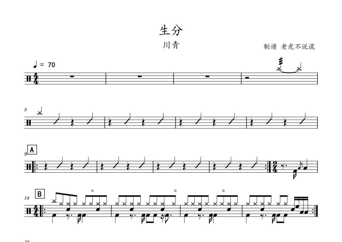 《生分》是川青演唱的一首歌曲,拍号为4/4拍,歌曲速度为每分钟70拍,这份鼓谱共有一张高清图谱,图谱由 @老虎不说谎 编配上传,图谱使用五线谱编配,使用这份生分架子鼓谱,你将能够轻松地敲打出这首川青的生分,快来尝试吧。