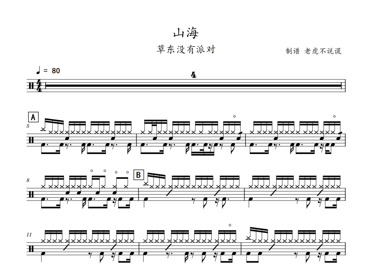 《山海》是草东没有派对演唱的一首歌曲,拍号为4/4拍,歌曲速度为每分钟80拍,这份鼓谱共有三张高清图谱,图谱由 @老虎不说谎 编配上传,图谱使用五线谱编配,使用这份山海架子鼓谱,你将能够轻松地敲打出这首草东没有派对的山海,快来尝试吧。