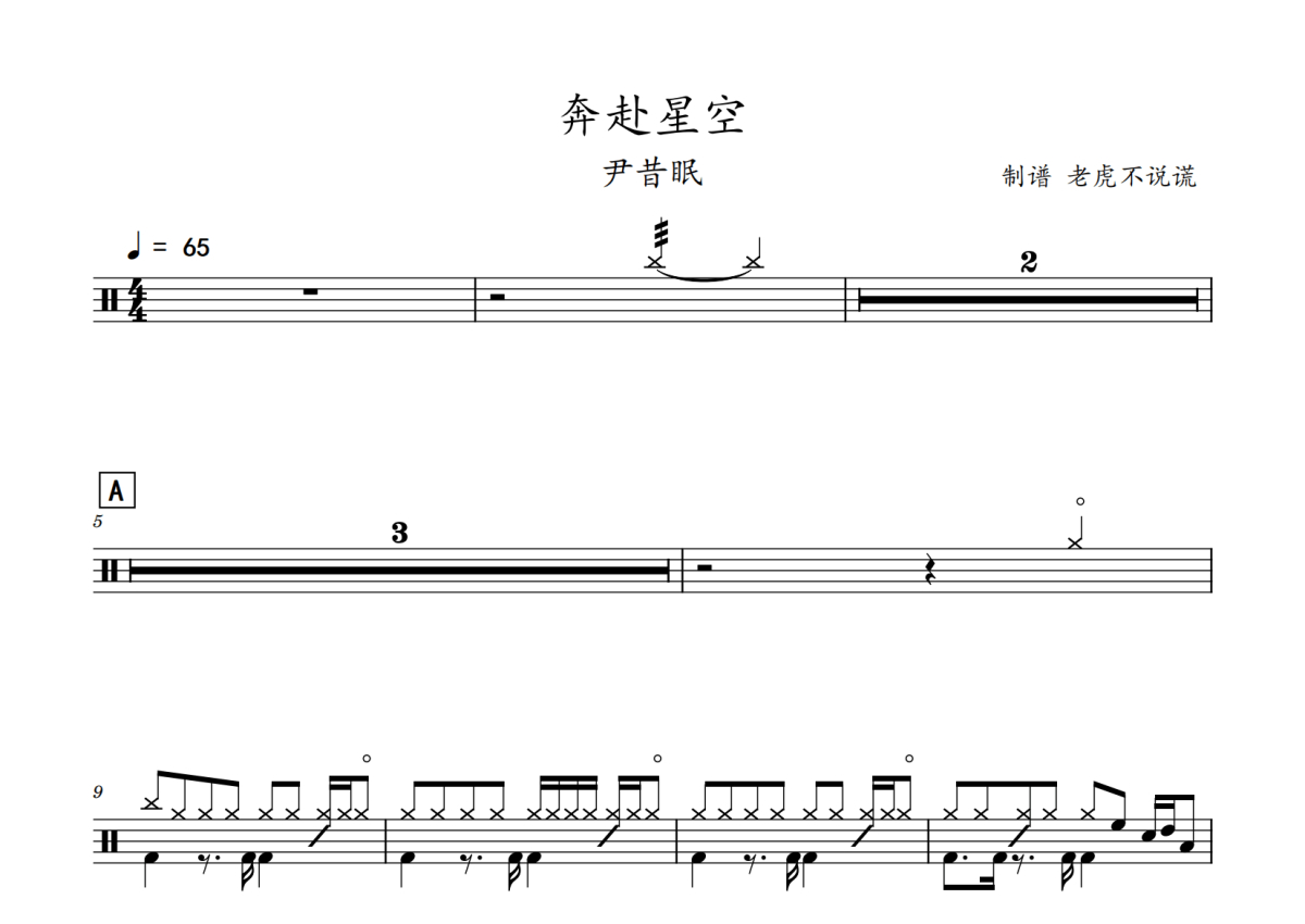 《奔赴星空》是尹昔眠演唱的一首歌曲,拍号为4/4拍,歌曲速度为每分钟65拍,这份鼓谱共有两张高清图谱,图谱由 @老虎不说谎 编配上传,图谱使用五线谱编配,使用这份奔赴星空架子鼓谱,你将能够轻松地敲打出这首尹昔眠的奔赴星空,快来尝试吧。