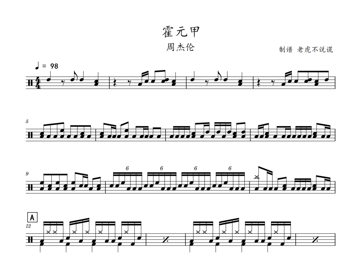 《霍元甲》是周杰伦演唱的一首歌曲,拍号为4/4拍,歌曲速度为每分钟98拍,这份鼓谱共有三张高清图谱,图谱由 @老虎不说谎 编配上传,图谱使用五线谱编配,使用这份霍元甲架子鼓谱,你将能够轻松地敲打出这首周杰伦的霍元甲,快来尝试吧。