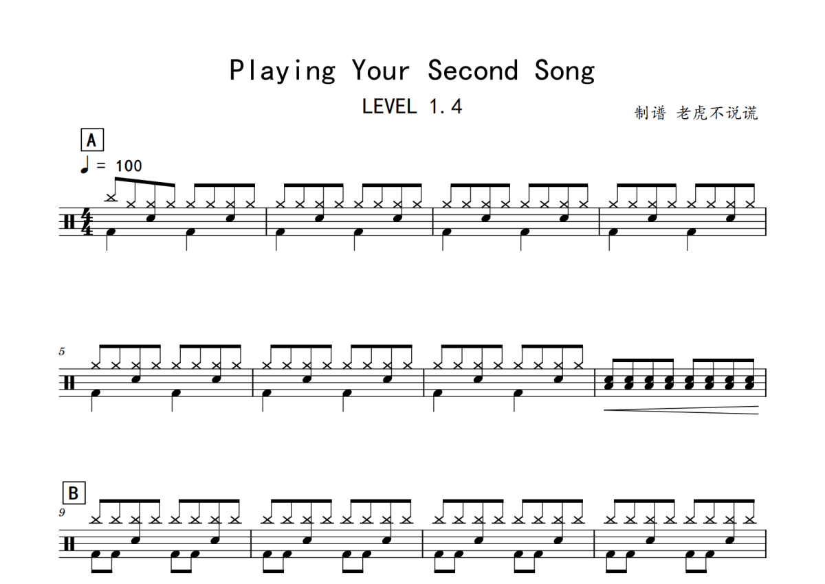 《Playing_Your_Second_Song》,练习,歌曲速度为每分钟100拍,这份鼓谱共有两张高清图谱,图谱由 @老虎不说谎 编配上传,图谱使用五线谱编配,使用这份Playing_Your_Second_Song架子鼓谱,你将能够轻松地敲打出这首Playing_Your_Second_Song,快来尝试吧。