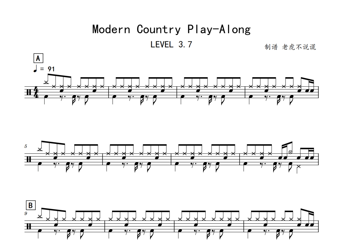 《Modern_Country_Play-Along》,练习,拍号为4/4拍,歌曲速度为每分钟91拍,这份鼓谱共有三张高清图谱,图谱由 @老虎不说谎 编配上传,图谱使用五线谱编配,使用这份Modern_Country_Play-Along架子鼓谱,你将能够轻松地敲打出这首Modern_Country_Play-Along,快来尝试吧。
