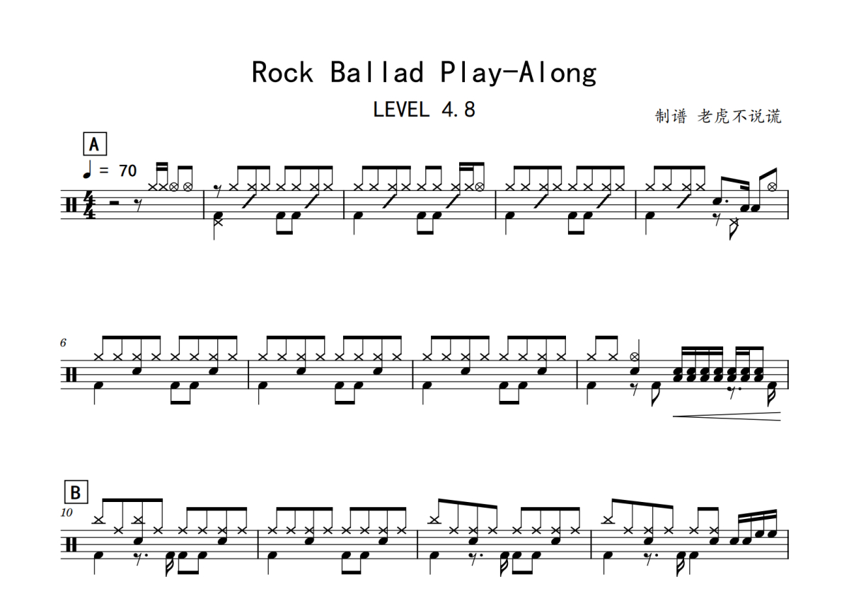《Rock_Ballad_Play-Along》是练习演唱的一首歌曲,练习,拍号为4/4拍,歌曲速度为每分钟70拍,这份鼓谱共有两张高清图谱,图谱由 @老虎不说谎 编配上传,图谱使用五线谱编配,使用这份Rock_Ballad_Play-Along架子鼓谱,你将能够轻松地敲打出这首练习的Rock_Ballad_Play-Along,快来尝试吧。