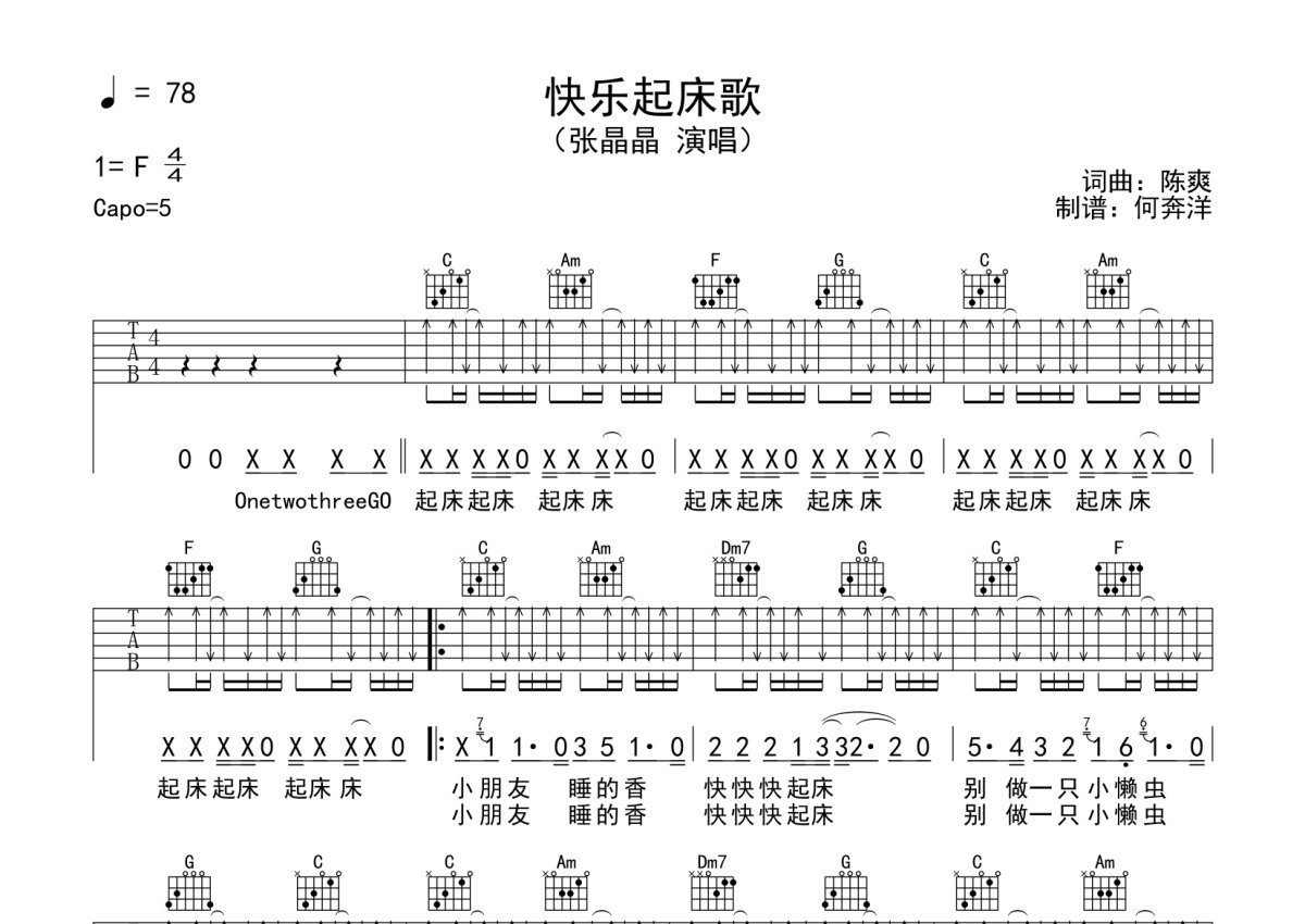 《快乐起床歌》是张晶晶演唱的一首歌曲,本吉他谱采用的是C调指法编配,这份吉他谱共有两张高清图谱,图谱由 @何奔洋 编配上传,图谱使用六线谱编配,包含吉他和弦指法、简谱以及歌词部分,曲谱配备了相关的音频提供试听,使用这份快乐起床歌吉他谱,可以让你更加方便地掌握这首歌曲的弹唱技巧,快来尝试吧。张晶晶《快乐起床歌》吉他谱_C调吉他弹唱谱。