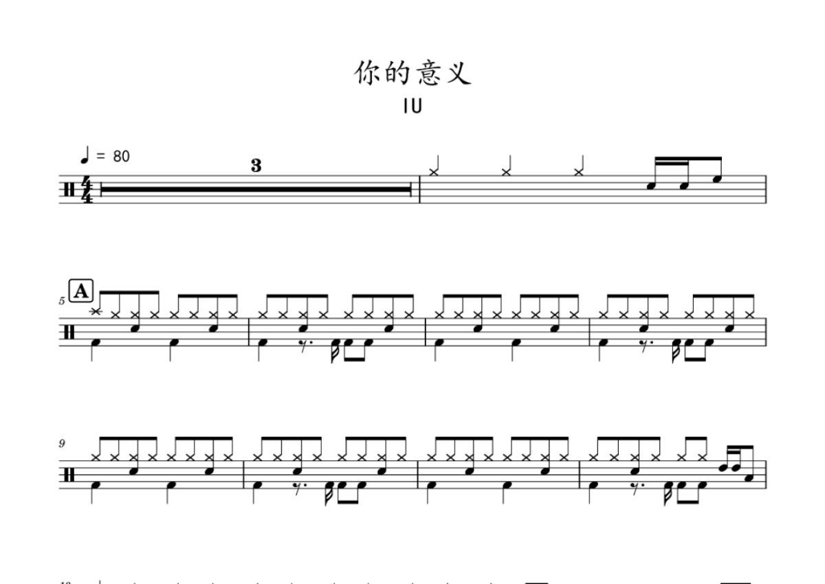 《你的意义》是IU演唱的一首歌曲,拍号为4/4拍,歌曲速度为每分钟80拍,这份鼓谱共有两张高清图谱,图谱由 @老虎不说谎 编配上传,图谱使用五线谱编配,使用这份你的意义架子鼓谱,你将能够轻松地敲打出这首IU的你的意义,快来尝试吧。