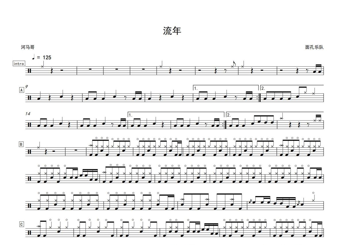 《流年》是面孔演唱的一首歌曲,这份鼓谱共有一张高清图谱,图谱由 @打鼓谱 编配上传,图谱使用五线谱编配,使用这份流年架子鼓谱,你将能够轻松地敲打出这首面孔的流年,快来尝试吧。原唱:王菲 改编编曲:面孔乐队。