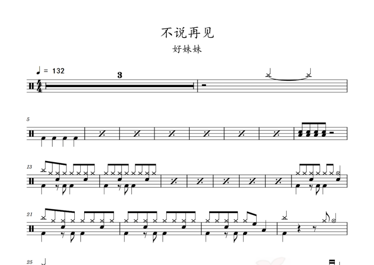 《不说再见》是好妹妹演唱的一首歌曲,拍号为4/4拍,歌曲速度为每分钟132拍,这份鼓谱共有三张高清图谱,图谱由 @老虎不说谎 编配上传,图谱使用五线谱编配,使用这份不说再见架子鼓谱,你将能够轻松地敲打出这首好妹妹的不说再见,快来尝试吧。