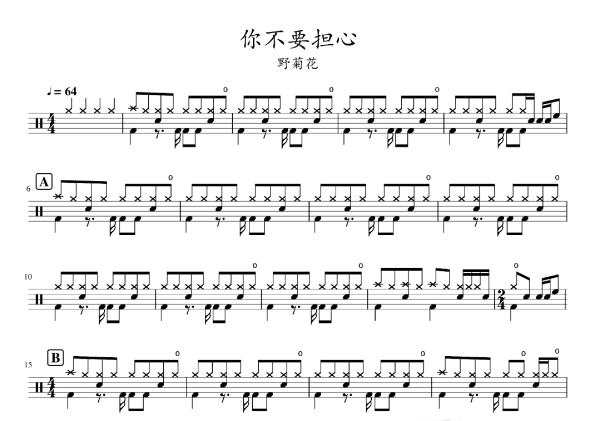 《你不要担心》是野菊花演唱的一首歌曲,拍号为4/4拍,歌曲速度为每分钟64拍,这份鼓谱共有两张高清图谱,图谱由 @老虎不说谎 编配上传,图谱使用五线谱编配,使用这份你不要担心架子鼓谱,你将能够轻松地敲打出这首野菊花的你不要担心,快来尝试吧。
