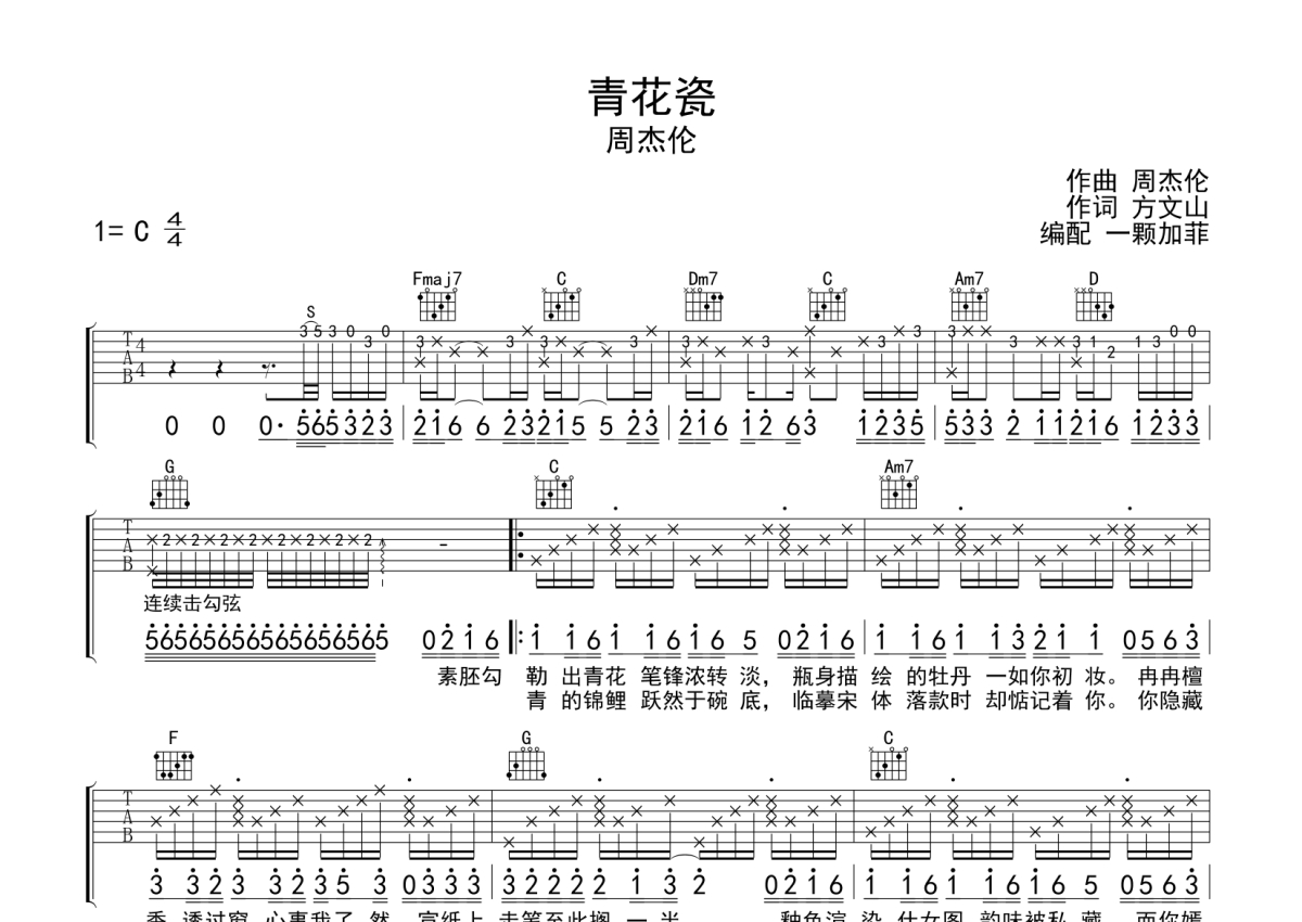 周杰伦《青花瓷》吉他谱 - C调弹唱六线谱