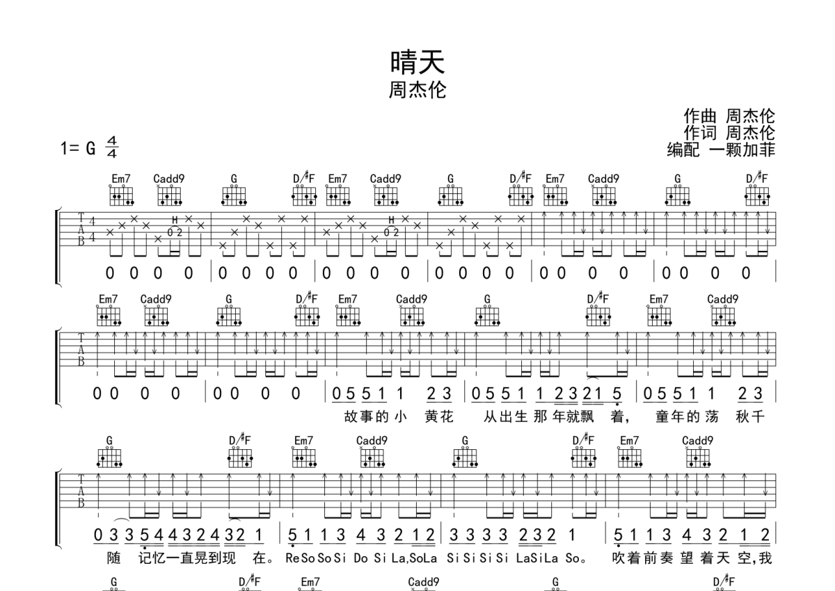 周杰伦《晴天》吉他谱 - G调弹唱六线谱