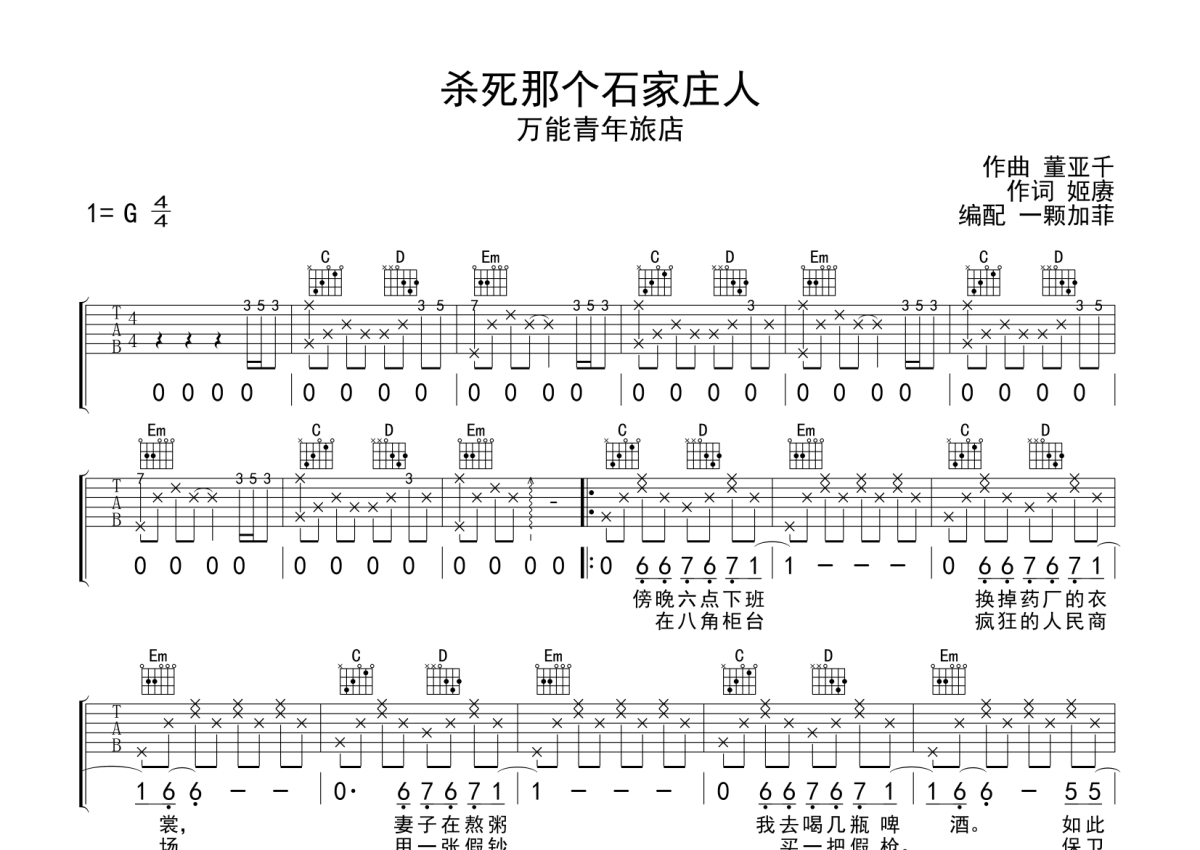 《杀死那个石家庄人》是万能青年旅店演唱的一首歌曲,拍号为4/4拍,本吉他谱采用的是G调指法编配,这份吉他谱共有两张高清图谱,图谱由 @一颗加菲 编配上传,图谱使用六线谱编配,包含吉他和弦指法、简谱以及歌词部分,使用这份杀死那个石家庄人吉他谱,可以让你更加方便地掌握这首歌曲的弹唱技巧,快来尝试吧。