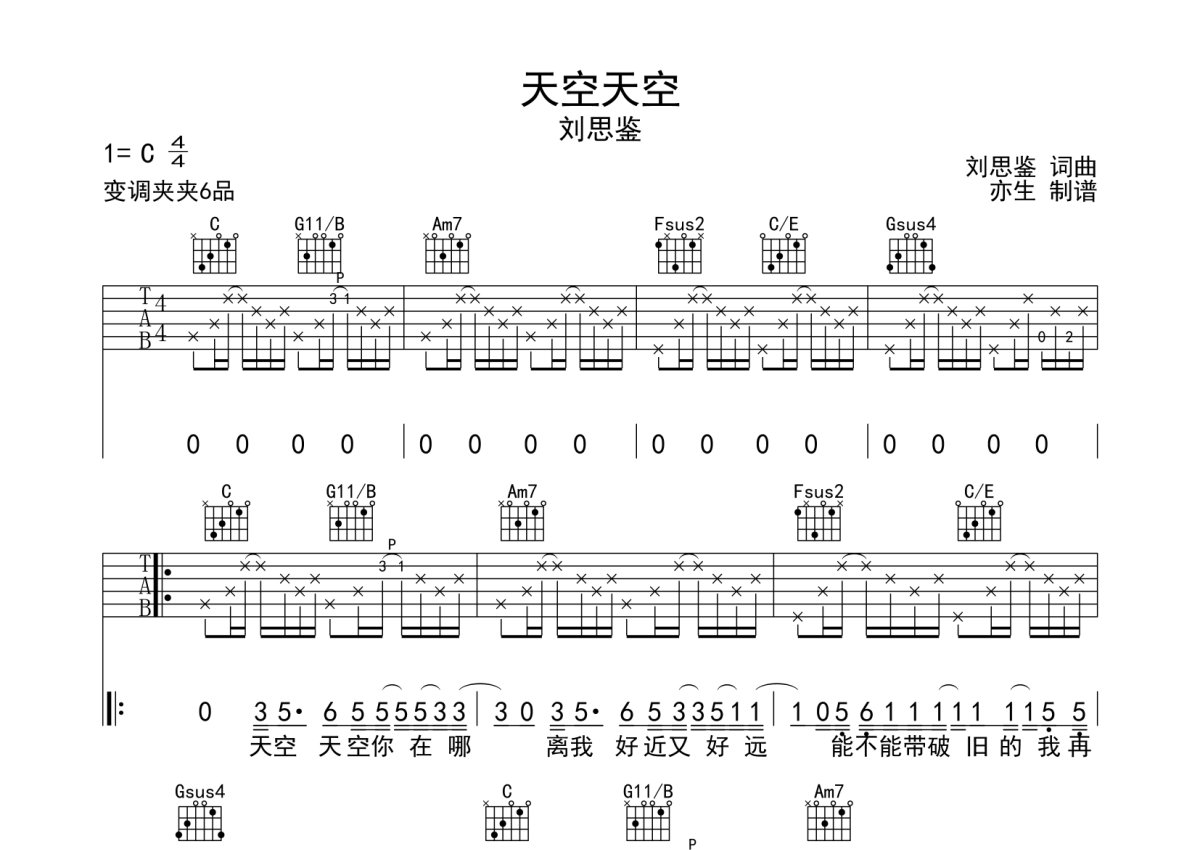 刘思鉴《天空天空》吉他谱 - C调弹唱六线谱