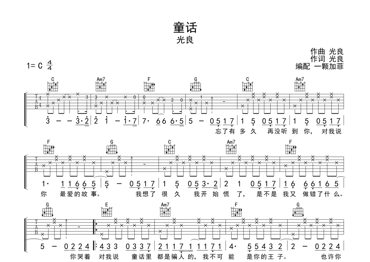 光良《童话》吉他谱 - C调弹唱六线谱