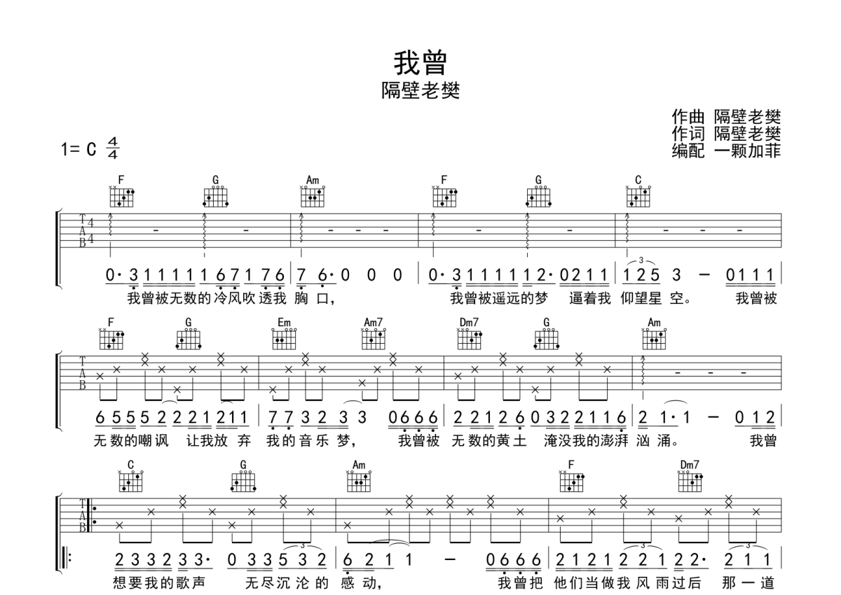 隔壁老樊《我曾》吉他谱 - C调弹唱六线谱