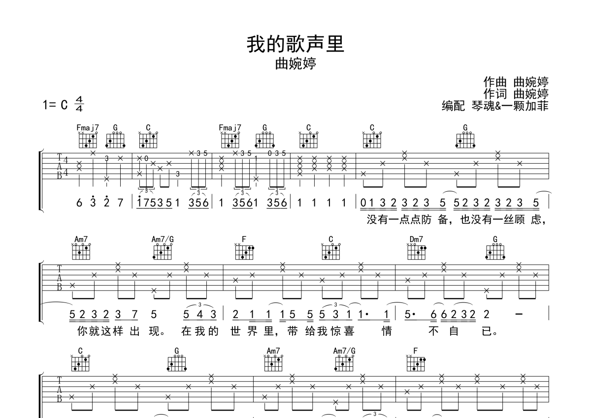 曲婉婷《我的歌声里》吉他谱 - C调弹唱六线谱