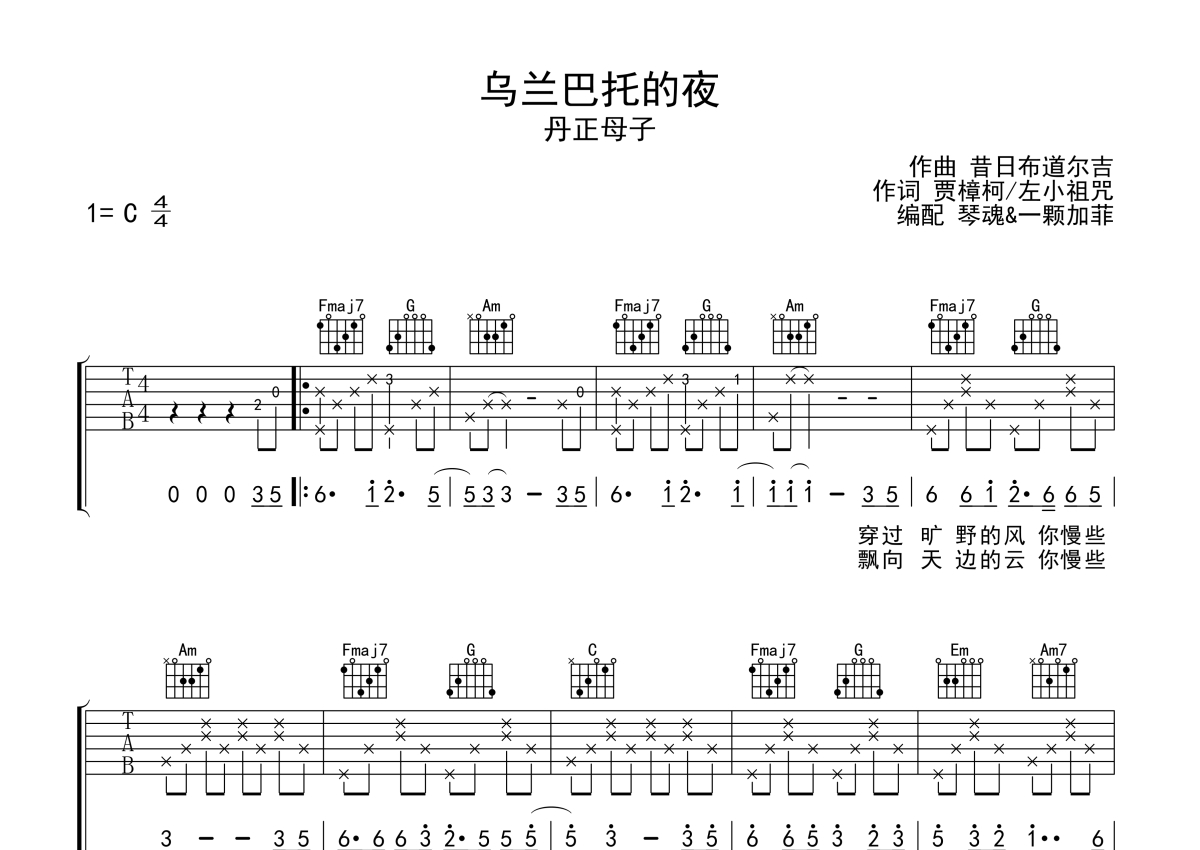 丹正母子《乌兰巴托的夜》吉他谱 - C调弹唱六线谱