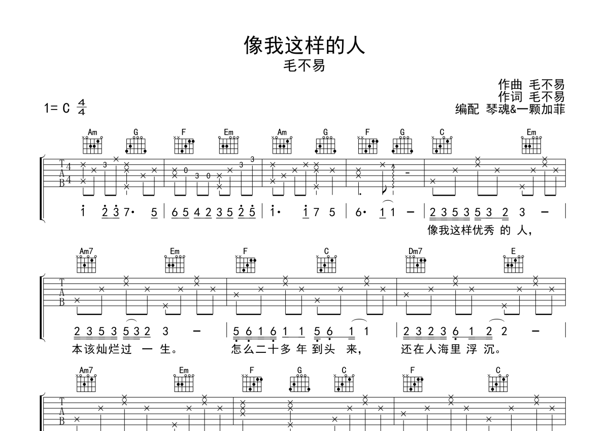 毛不易《像我这样的人》吉他谱 - C调弹唱六线谱