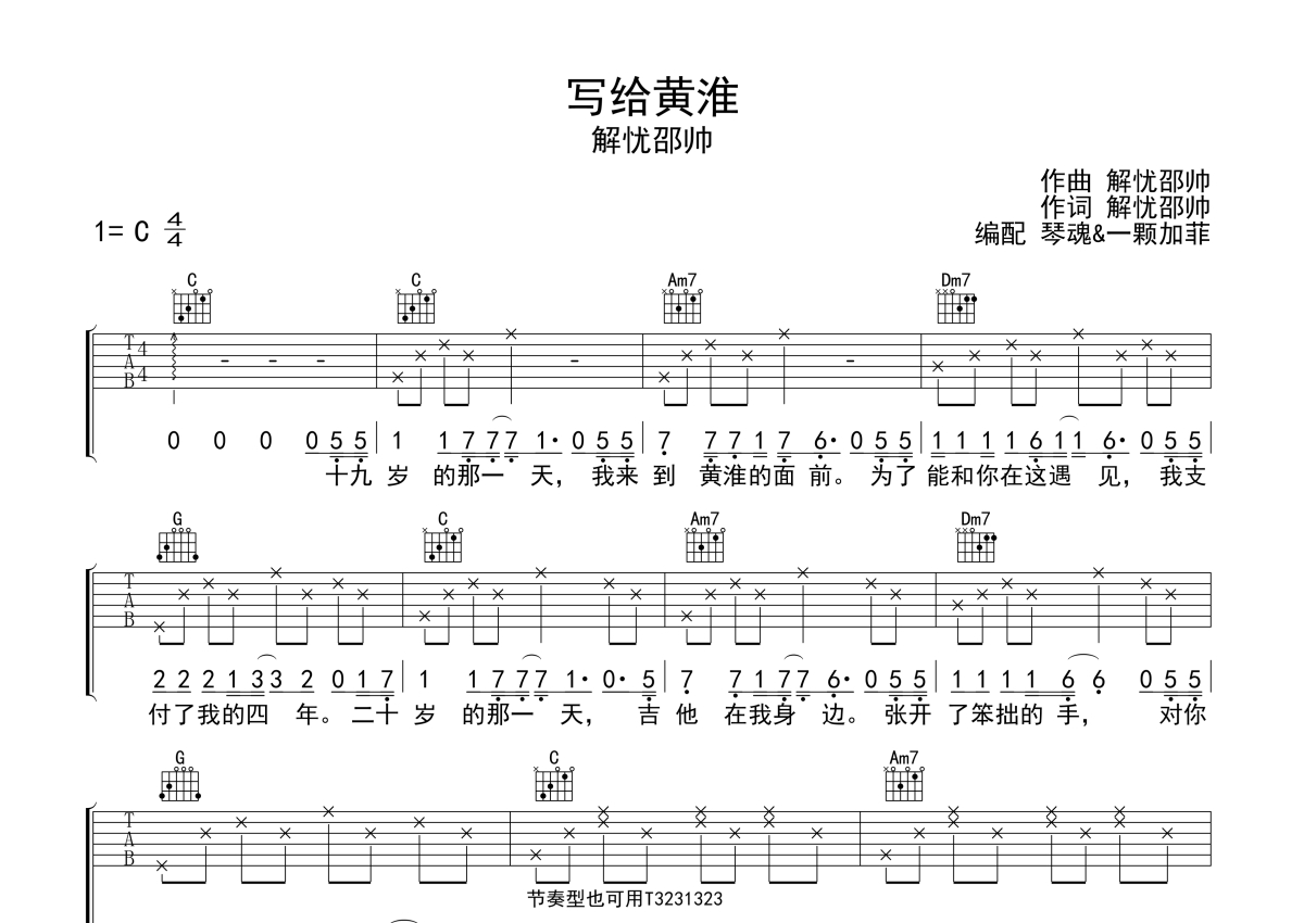 解忧邵帅《写给黄淮》吉他谱 - C调弹唱六线谱