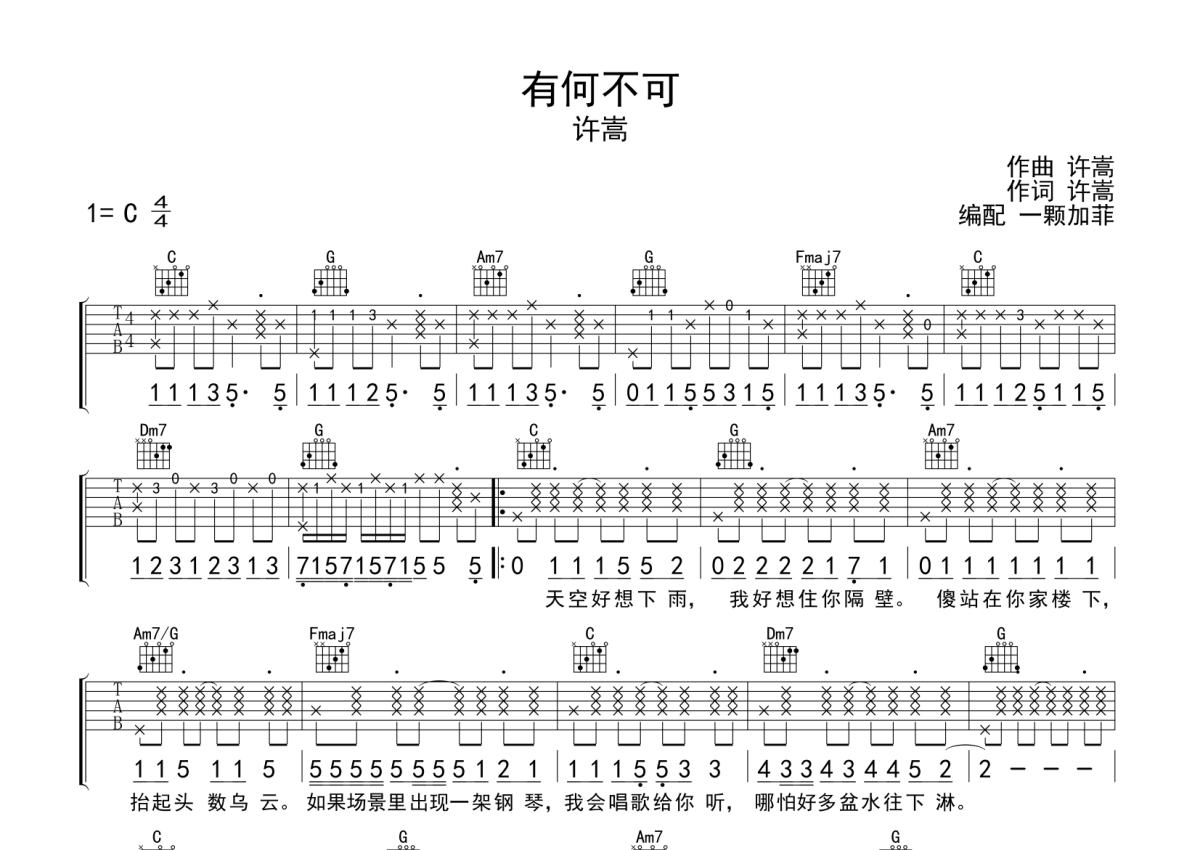 许嵩《有何不可》吉他谱 - C调弹唱六线谱
