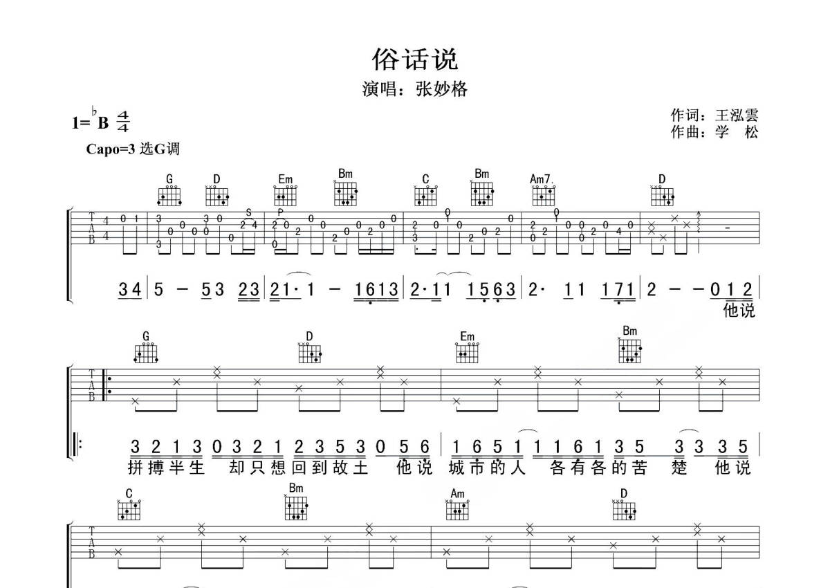 张妙格《俗话说》吉他谱 - G调弹唱六线谱