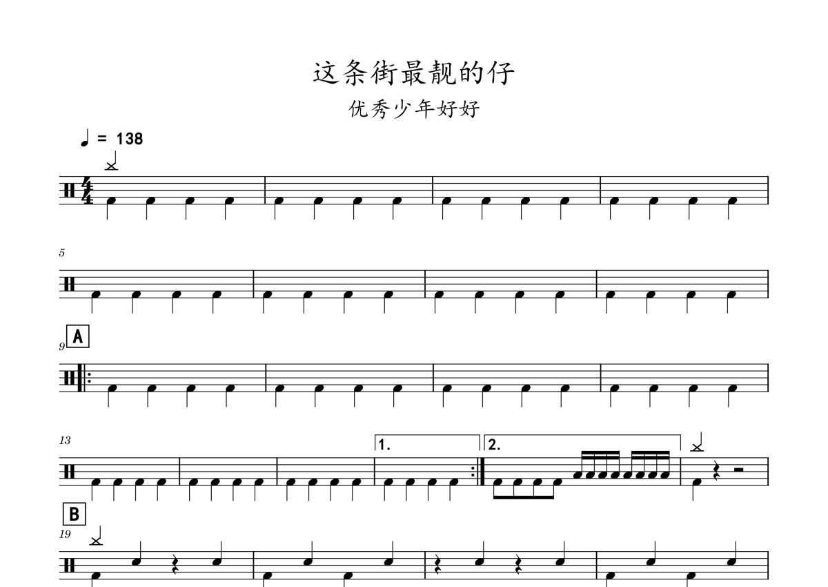 《这条街最靓的仔》是优秀少年好好演唱的一首歌曲,拍号为4/4拍,歌曲速度为每分钟138拍,这份鼓谱共有两张高清图谱,图谱由 @老虎不说谎 编配上传,图谱使用五线谱编配,使用这份这条街最靓的仔架子鼓谱,你将能够轻松地敲打出这首优秀少年好好的这条街最靓的仔,快来尝试吧。