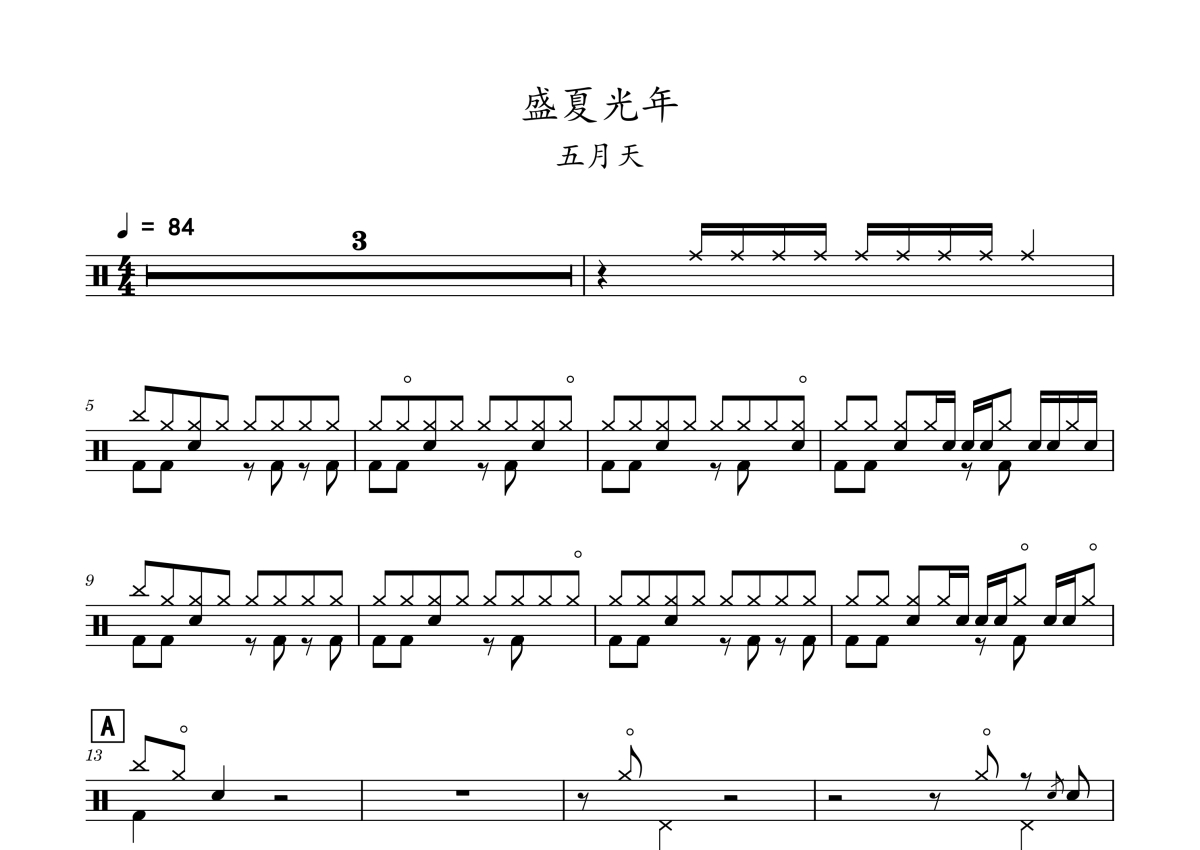 《盛夏光年》是五月天演唱的一首歌曲,拍号为4/4拍,歌曲速度为每分钟84拍,这份鼓谱共有三张高清图谱,图谱由 @老虎不说谎 编配上传,图谱使用五线谱编配,使用这份盛夏光年架子鼓谱,你将能够轻松地敲打出这首五月天的盛夏光年,快来尝试吧。