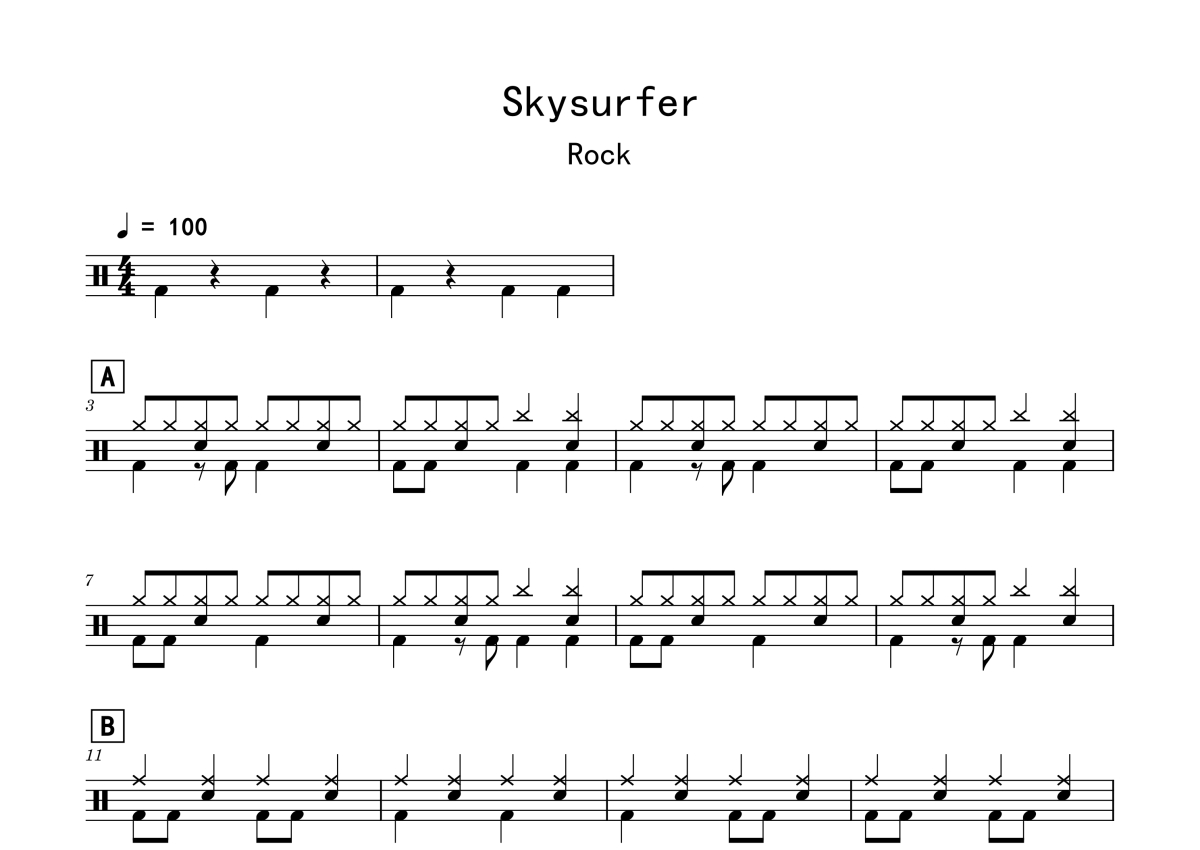 《Skysurfer》是练习演唱的一首歌曲,拍号为4/4拍,歌曲速度为每分钟100拍,这份鼓谱共有一张高清图谱,图谱由 @老虎不说谎 编配上传,图谱使用五线谱编配,使用这份Skysurfer架子鼓谱,你将能够轻松地敲打出这首练习的Skysurfer,快来尝试吧。