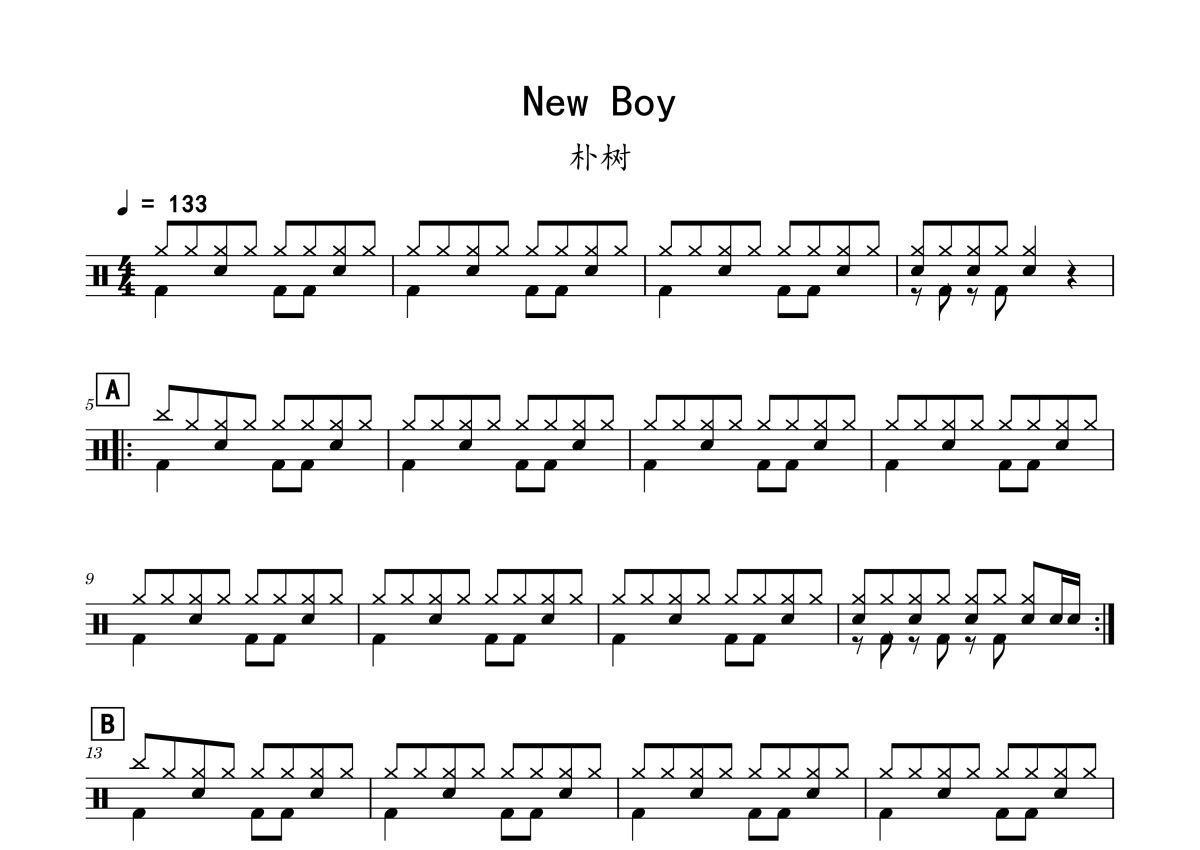 《New Boy》是朴树演唱的一首歌曲,拍号为4/4拍,歌曲速度为每分钟133拍,这份鼓谱共有两张高清图谱,图谱由 @老虎不说谎 编配上传,图谱使用五线谱编配,使用这份New Boy架子鼓谱,你将能够轻松地敲打出这首朴树的New Boy,快来尝试吧。