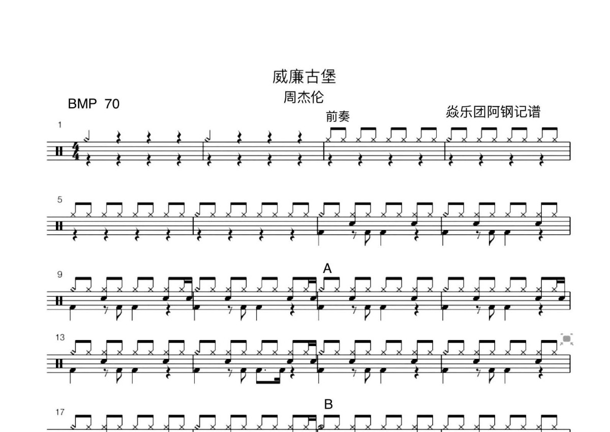 《威廉古堡》是周杰伦演唱的一首歌曲,这份鼓谱共有两张高清图谱,图谱由 @打鼓谱 编配上传,图谱使用五线谱编配,使用这份威廉古堡架子鼓谱,你将能够轻松地敲打出这首周杰伦的威廉古堡,快来尝试吧。《威廉古堡》是周杰伦演唱的一首歌曲,由周杰伦作曲,方文山作词,洪敬尧编曲,收录于周杰伦2001年9月20日发行的专辑《范特西》中。 2002年方文山凭借该歌曲获得第13届台湾金曲奖最佳作词人奖。周杰伦(Jay Chou),1979年1月18日出生于台湾省新北市,祖籍福建省泉州市永春县,中国台湾流行乐男歌手、原创音乐人、演员、导演、编剧,毕业于淡江中学。