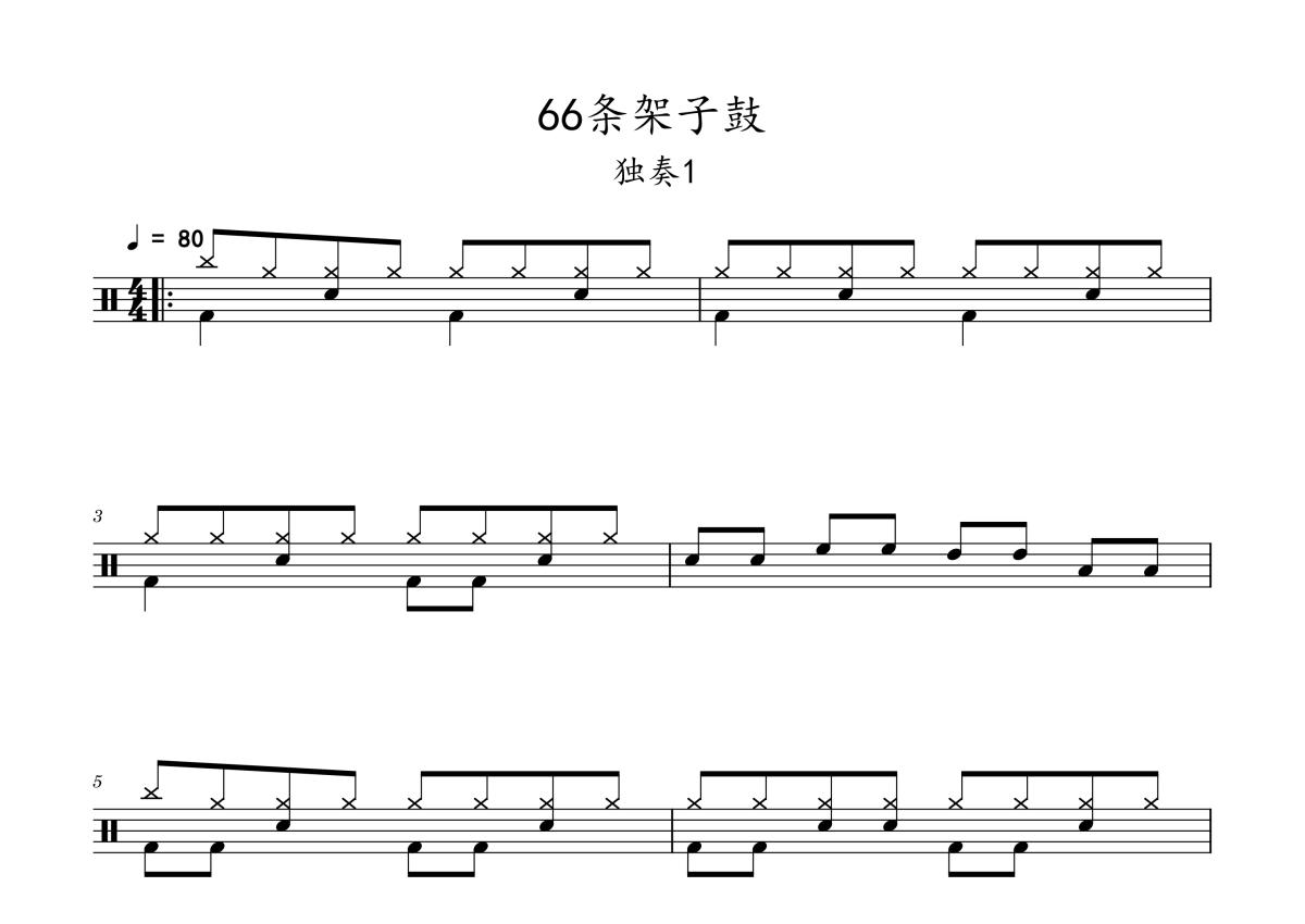 《独奏1》是练习演唱的一首歌曲,拍号为4/4拍,歌曲速度为每分钟80拍,这份鼓谱共有一张高清图谱,图谱由 @老虎不说谎 编配上传,图谱使用五线谱编配,使用这份独奏1架子鼓谱,你将能够轻松地敲打出这首练习的独奏1,快来尝试吧。