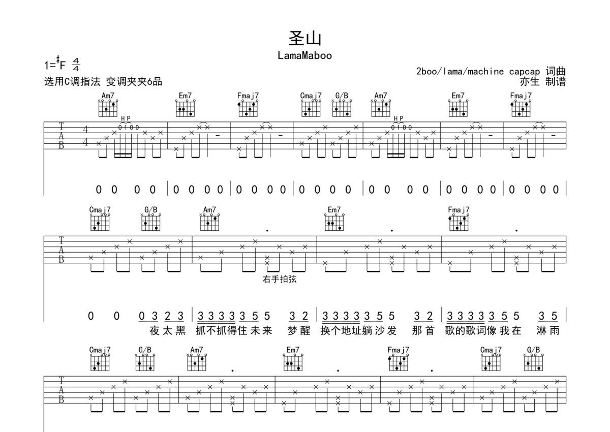 LamaMaboo《圣山》吉他谱 - C调弹唱六线谱