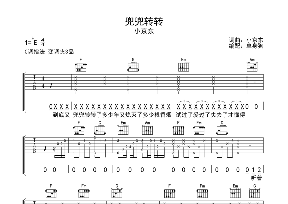 《兜兜转转》是小京东演唱的一首歌曲,拍号为4/4拍,歌曲原调为Eb调,但由于原调指法比较难,为了方便弹奏,本吉他谱采用的是C调指法编配,变调夹3品弹奏即为原调,当然也可以根据自己的音域改变变调夹位置,或者通过改变和弦调性,以方便自己弹奏,这份吉他谱共有四张高清图谱,图谱由 @单身狗 编配上传,图谱使用六线谱编配,包含吉他和弦指法、简谱以及歌词部分,使用这份兜兜转转吉他谱,可以让你更加方便地掌握这首歌曲的弹唱技巧,快来尝试吧。