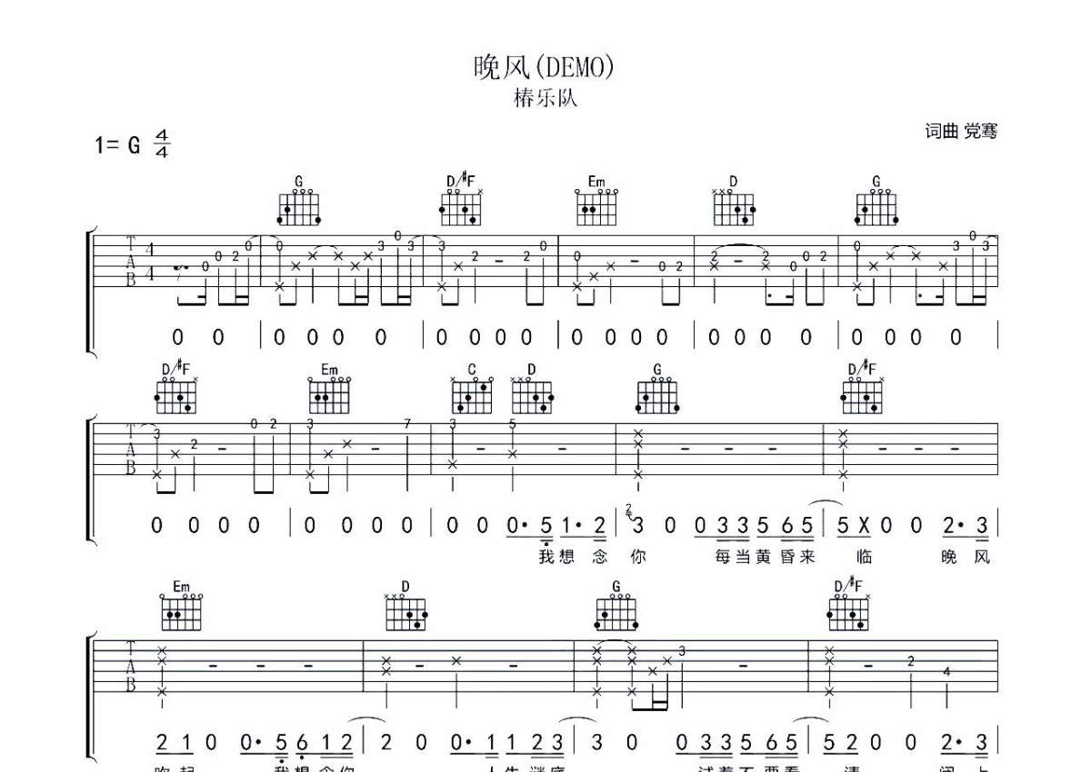 椿乐队《晚风》吉他谱 - G调弹唱六线谱