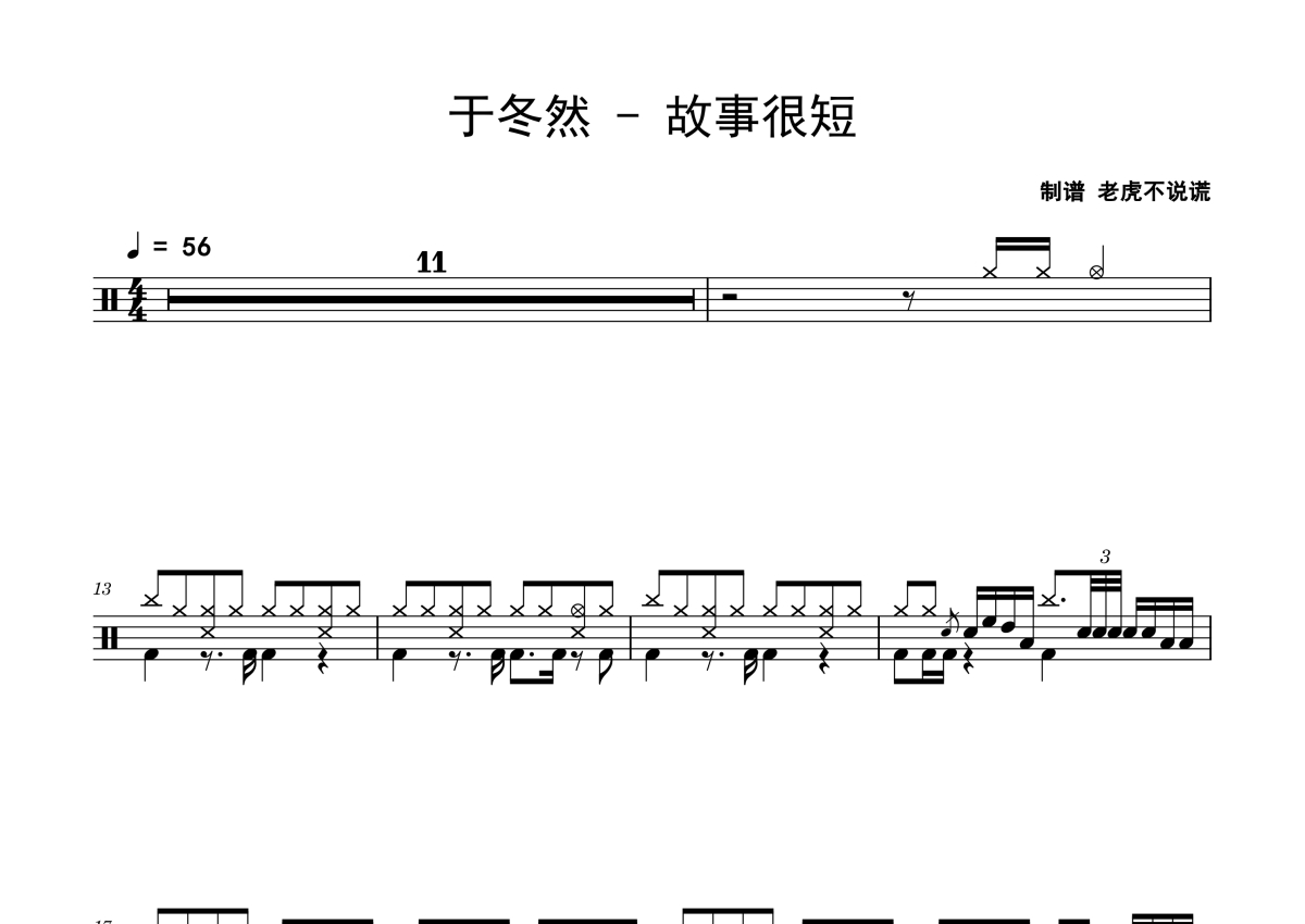 《故事很短》是于冬然演唱的一首歌曲,拍号为4/4拍,歌曲速度为每分钟56拍,这份鼓谱共有两张高清图谱,图谱由 @老虎不说谎 编配上传,图谱使用五线谱编配,使用这份故事很短架子鼓谱,你将能够轻松地敲打出这首于冬然的故事很短,快来尝试吧。