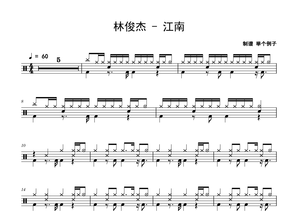 《江南》是林俊杰演唱的一首歌曲,拍号为4/4拍,歌曲速度为每分钟60拍,这份鼓谱共有两张高清图谱,图谱由 @老虎不说谎 编配上传,图谱使用五线谱编配,使用这份江南架子鼓谱,你将能够轻松地敲打出这首林俊杰的江南,快来尝试吧。