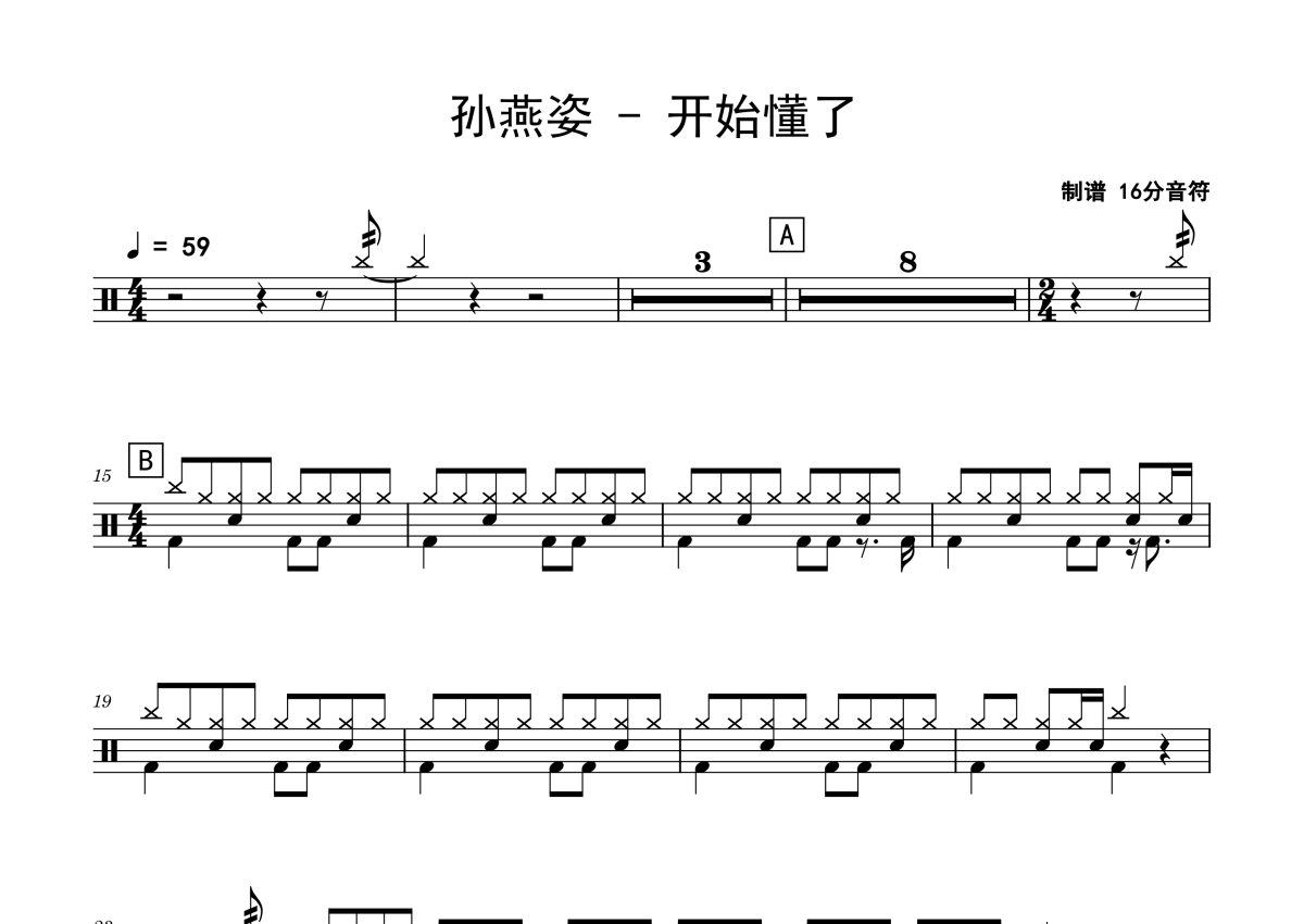 《开始懂了》是孙燕姿演唱的一首歌曲,拍号为4/4拍,歌曲速度为每分钟59拍,这份鼓谱共有两张高清图谱,图谱由 @老虎不说谎 编配上传,图谱使用五线谱编配,使用这份开始懂了架子鼓谱,你将能够轻松地敲打出这首孙燕姿的开始懂了,快来尝试吧。