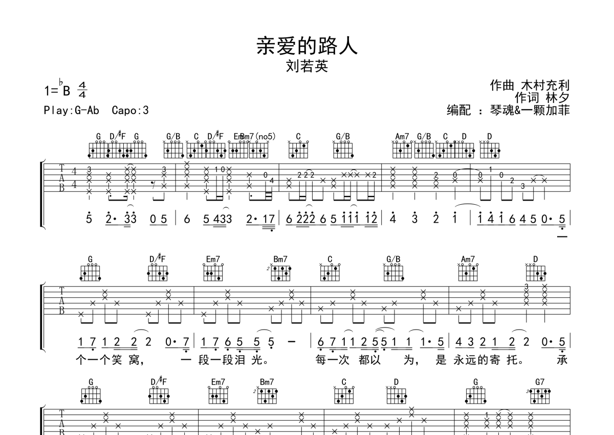 《亲爱的路人》是刘若英演唱的一首歌曲,拍号为4/4拍,歌曲原调为Bb调,但由于原调指法比较难,为了方便弹奏,本吉他谱采用的是G调指法编配,变调夹3品弹奏即为原调,当然也可以根据自己的音域改变变调夹位置,或者通过改变和弦调性,以方便自己弹奏,这份吉他谱共有三张高清图谱,图谱由 @一颗加菲 编配上传,图谱使用六线谱编配,包含吉他和弦指法、简谱以及歌词部分,曲谱配备了相关的音频提供试听,使用这份亲爱的路人吉他谱,可以让你更加方便地掌握这首歌曲的弹唱技巧,快来尝试吧。