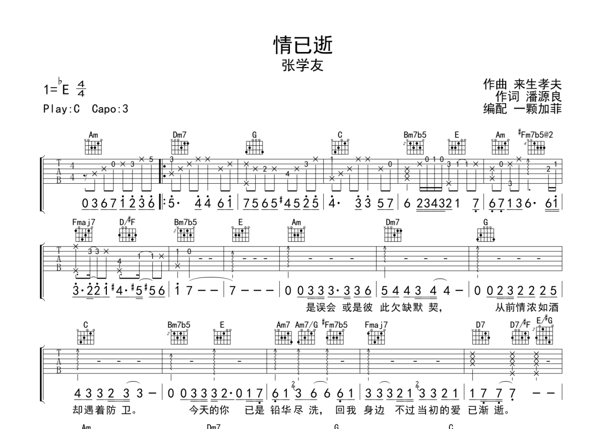 《情已逝》是张学友演唱的一首歌曲,拍号为4/4拍,歌曲原调为Eb调,但由于原调指法比较难,为了方便弹奏,本吉他谱采用的是C调指法编配,变调夹3品弹奏即为原调,当然也可以根据自己的音域改变变调夹位置,或者通过改变和弦调性,以方便自己弹奏,这份吉他谱共有两张高清图谱,图谱由 @一颗加菲 编配上传,图谱使用六线谱编配,包含吉他和弦指法、简谱以及歌词部分,曲谱配备了相关的音频提供试听,使用这份情已逝吉他谱,可以让你更加方便地掌握这首歌曲的弹唱技巧,快来尝试吧。