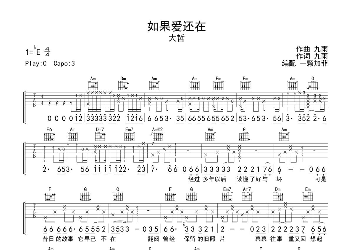 《如果爱还在》是大哲演唱的一首歌曲,拍号为4/4拍,歌曲原调为Eb调,但由于原调指法比较难,为了方便弹奏,本吉他谱采用的是C调指法编配,变调夹3品弹奏即为原调,当然也可以根据自己的音域改变变调夹位置,或者通过改变和弦调性,以方便自己弹奏,这份吉他谱共有两张高清图谱,图谱由 @一颗加菲 编配上传,图谱使用六线谱编配,包含吉他和弦指法、简谱以及歌词部分,曲谱配备了相关的音频提供试听,使用这份如果爱还在吉他谱,可以让你更加方便地掌握这首歌曲的弹唱技巧,快来尝试吧。