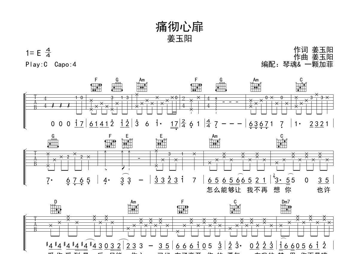 姜玉阳《痛彻心扉》吉他谱 - C调弹唱六线谱