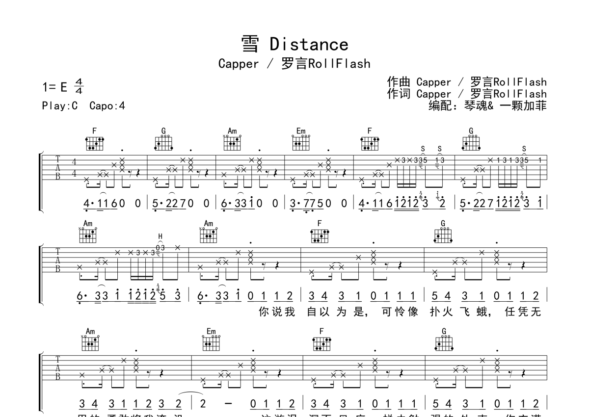 《雪 Distance》是Capper / 罗言RollFlash演唱的一首歌曲,拍号为4/4拍,歌曲原调为E调,但由于原调指法比较难,为了方便弹奏,本吉他谱采用的是C调指法编配,变调夹4品弹奏即为原调,当然也可以根据自己的音域改变变调夹位置,或者通过改变和弦调性,以方便自己弹奏,这份吉他谱共有两张高清图谱,图谱由 @一颗加菲 编配上传,图谱使用六线谱编配,包含吉他和弦指法、简谱以及歌词部分,使用这份雪 Distance吉他谱,可以让你更加方便地掌握这首歌曲的弹唱技巧,快来尝试吧。