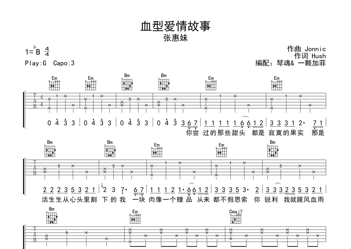 《血腥爱情故事》是张惠妹演唱的一首歌曲,拍号为4/4拍,歌曲原调为Bb调,但由于原调指法比较难,为了方便弹奏,本吉他谱采用的是G调指法编配,变调夹3品弹奏即为原调,当然也可以根据自己的音域改变变调夹位置,或者通过改变和弦调性,以方便自己弹奏,这份吉他谱共有三张高清图谱,图谱由 @一颗加菲 编配上传,图谱使用六线谱编配,包含吉他和弦指法、简谱以及歌词部分,曲谱配备了相关的音频提供试听,使用这份血腥爱情故事吉他谱,可以让你更加方便地掌握这首歌曲的弹唱技巧,快来尝试吧。