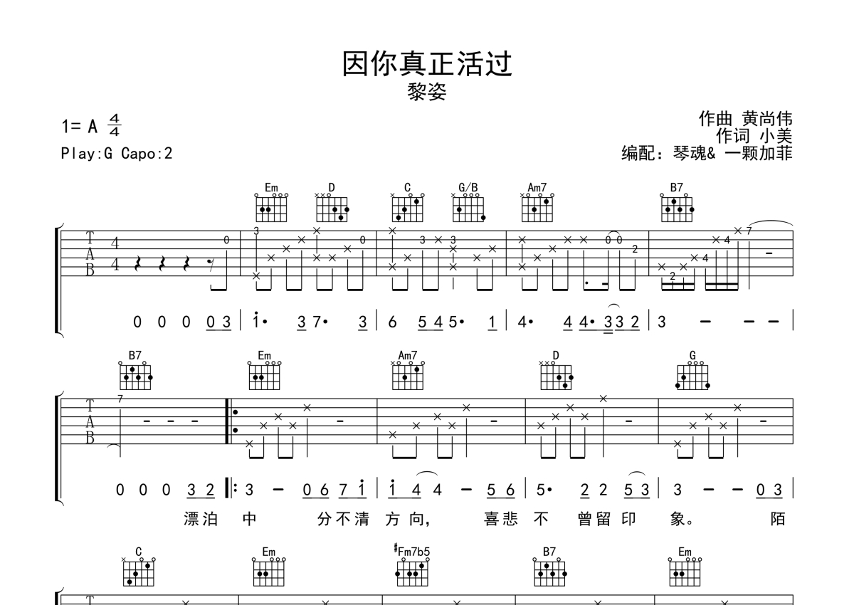 黎姿《因你真正活过》吉他谱 - G调弹唱六线谱