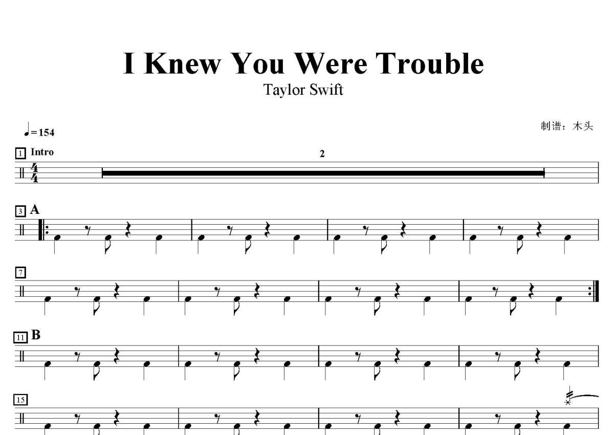 Taylor Swift《I Knew You Were Trouble》鼓谱 - 架子鼓谱