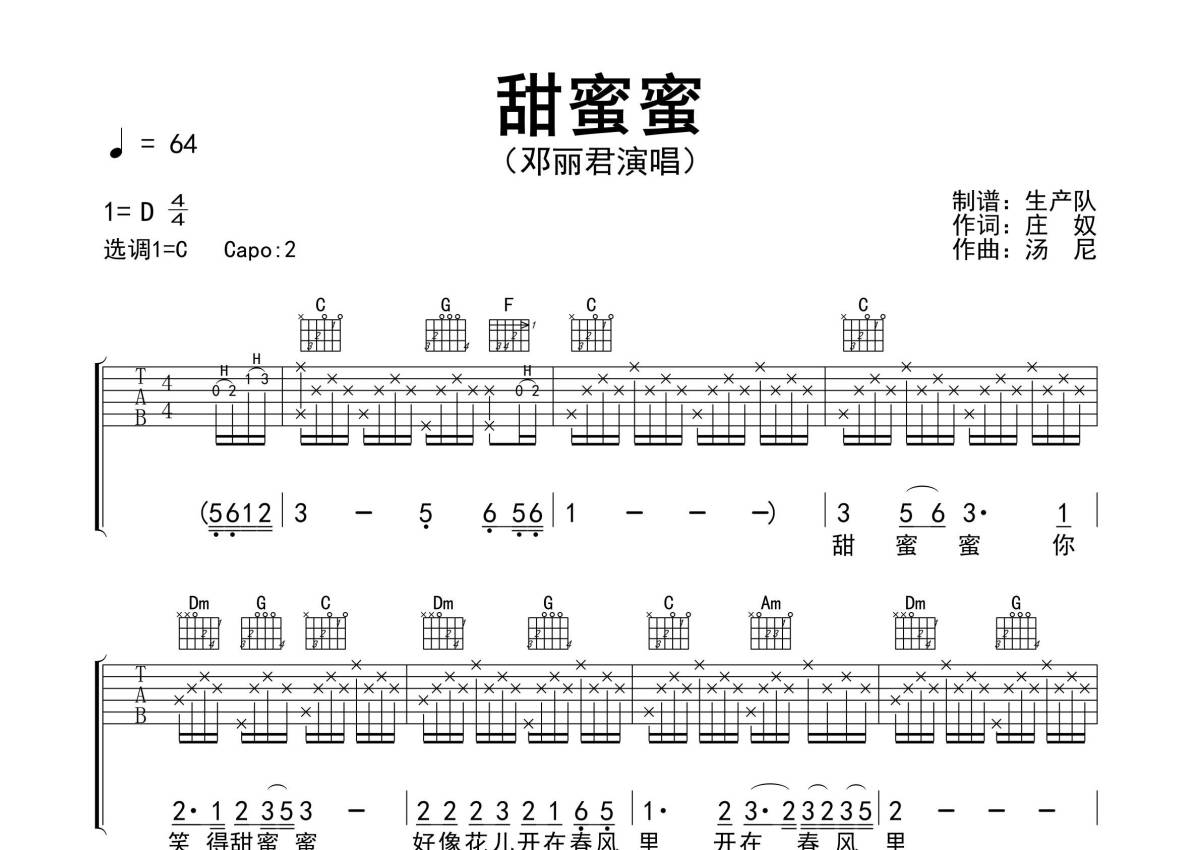 《甜蜜蜜》是邓丽君演唱的一首歌曲,精编完美版,拍号为4/4拍,歌曲速度为每分钟64拍,歌曲原调为D调,但由于原调指法比较难,为了方便弹奏,本吉他谱采用的是C调指法编配,变调夹2品弹奏即为原调,当然也可以根据自己的音域改变变调夹位置,或者通过改变和弦调性,以方便自己弹奏,这份吉他谱共有两张高清图谱,图谱由 @生产队 编配上传,图谱使用六线谱编配,包含吉他和弦指法、简谱以及歌词部分,使用这份甜蜜蜜吉他谱,可以让你更加方便地掌握这首歌曲的弹唱技巧,快来尝试吧。《甜蜜蜜》是邓丽君演唱的歌曲,曲谱取自印度尼西亚民谣,由庄奴填词,该曲是最早在中国大陆普及和传唱的流行歌曲之一,2008年该曲被《南方周末》报评选为改革开放三十年十大经典歌曲之一 。本吉他谱根据原版采用C调指法编配,完整的前奏、间奏、尾奏及SOLO编配,怀旧经典!。